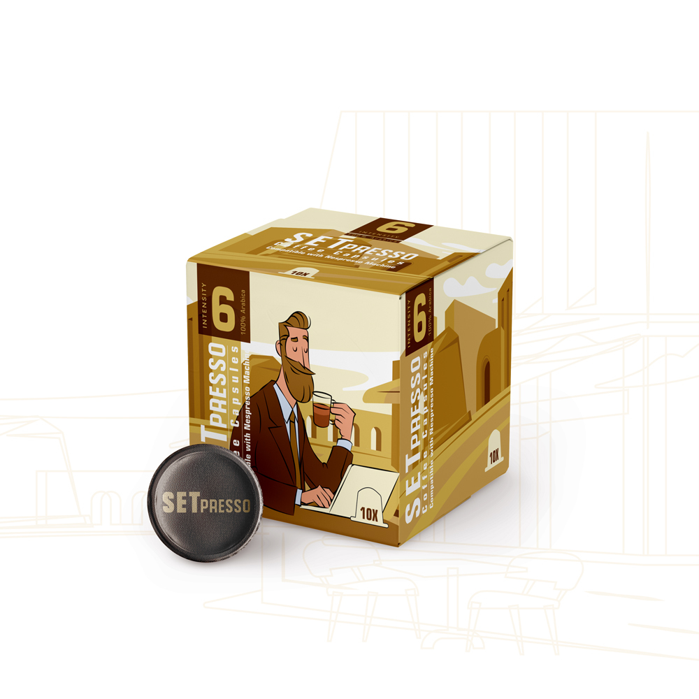 کپسول نسپرسو ایرانی قهوه ست مدل Gold سازگار با دستگاههای کپسولی نسپرسو است. ترکیب این کپسول قهوه ایرانی 100% عربیکا بوده و با برشتهکاری متوسط به بالا از اسیدیته متوسط و بسیار خوشایند و متوازن به همراه تلخی متوسط به پایین به همراه تنواری متوسط است.